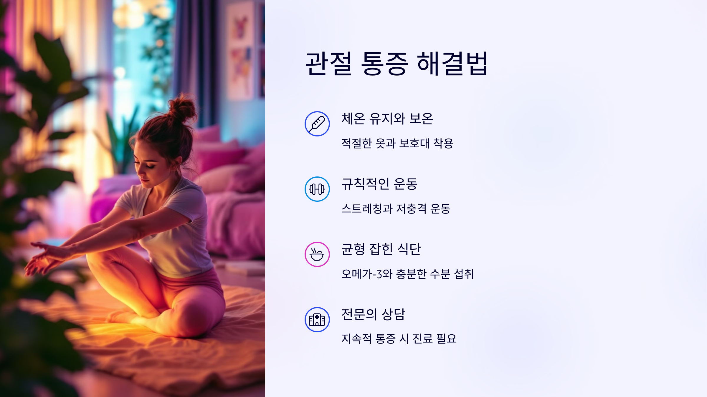 만약 통증이 지속되거나 심해진다면 반드시 전문가의 도움을 받아야 합니다. 정형외과나 류마티스 전문의를 찾아 정확한 진단을 받고, 필요하다면 치료를 병행해야 합니다. 환절기는 누구에게나 찾아오지만, 미리 대비하고 관리한다면 관절 통증 없이 건강하게 보낼 수 있습니다. 작은 생활 습관 변화만으로도 큰 효과를 볼 수 있으니, 오늘부터라도 실천해보는 것이 어떨까요?