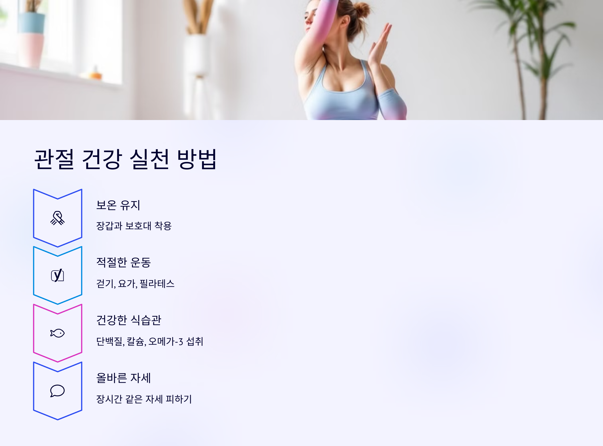 관절 건강을 유지하려면 생활 속에서 꾸준한 실천이 필요합니다. 몸을 따뜻하게 유지하는 것이 기본입니다. 온도가 낮아질 때는 보온을 철저히 하고, 관절 부위를 따뜻하게 유지하는 것이 좋습니다. 특히, 장갑이나 보호대를 착용하면 관절에 가해지는 스트레스를 줄일 수 있습니다. 운동도 중요한 요소입니다. 적절한 운동을 통해 근육을 강화하고 관절을 보호할 수 있습니다. 걷기나 요가, 필라테스 같은 운동은 관절에 무리가 가지 않으면서도 좋은 영향을 줄 수 있습니다.