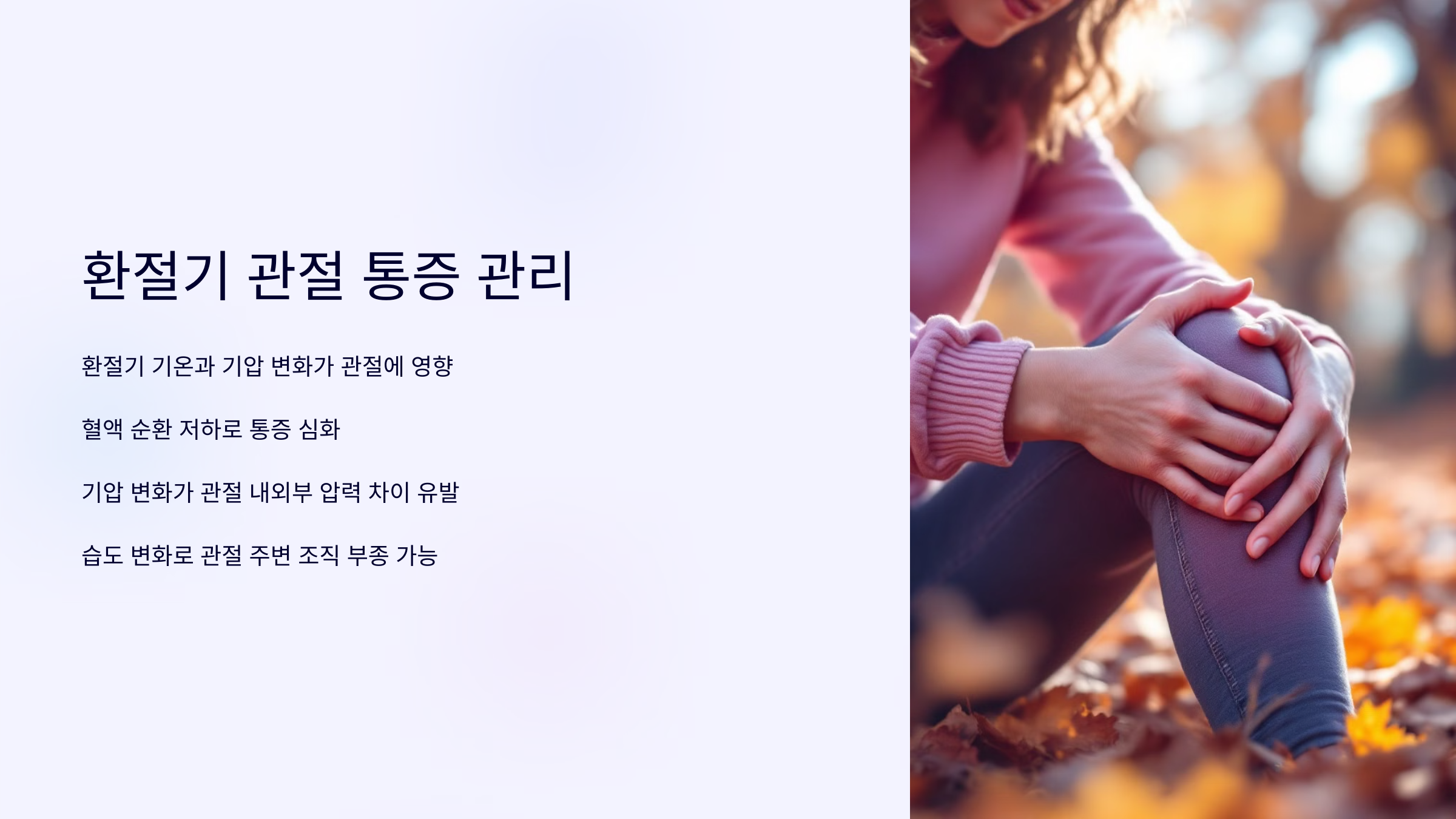 환절기가 되면 많은 사람들이 관절 통증을 호소합니다. 갑자기 날씨가 변하면서 기온과 기압의 변화가 관절에 영향을 미칠 수 있기 때문입니다. 특히 노화로 인해 관절이 약해진 중장년층이나 관절염을 앓고 있는 사람들에게 더욱 두드러집니다.